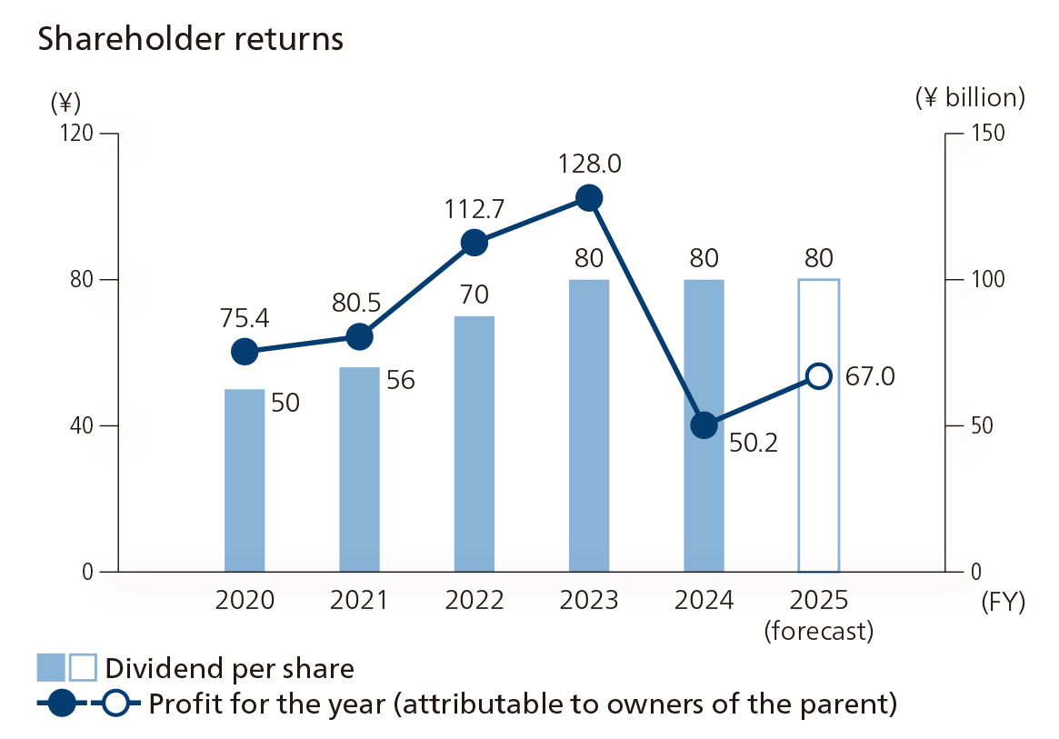 With a progressive dividend policy (2025 forecast: ¥80 per share), we will reduce the ratio of cross-shareholding.
